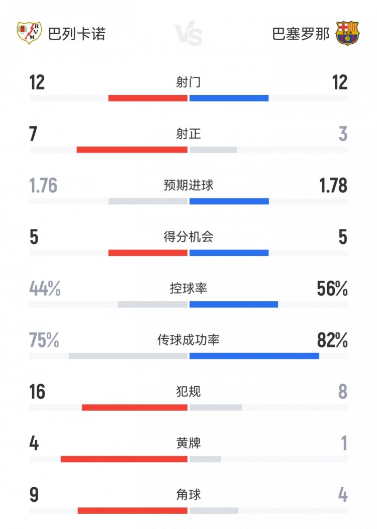 巴萨1-1巴列卡诺数据:射门12-12射正3-7,得分契机5-5,角球4-9