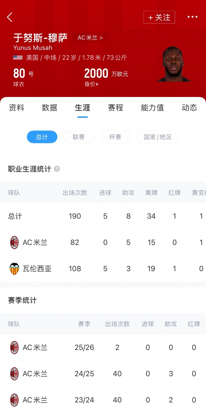 穆萨现年22岁,司职中场,加盟米兰后球员认为出场82次,孝敬5助。现在穆萨德回身价为2000万欧元。
