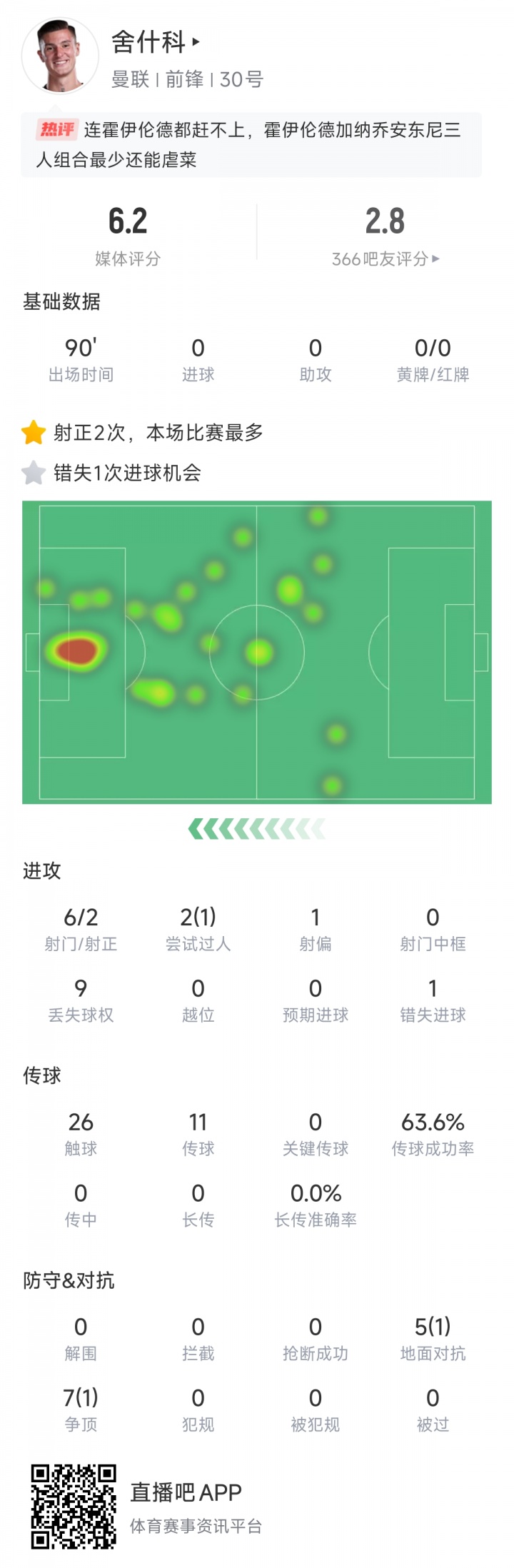 8500万中锋…22岁舍什科152分钟0球0助 踢英乙12挣扎2成效&失绝杀