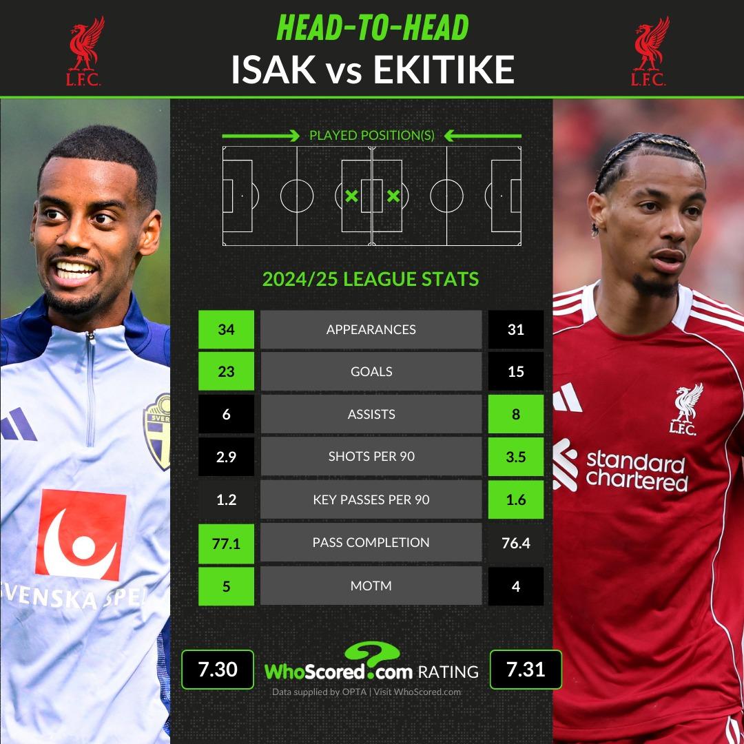 虎扑09月05日讯Whoscored对比利物浦在今夏引进的两位强援——伊萨克和埃基蒂克在上赛季的联赛数据: