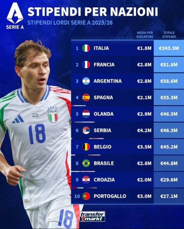 意甲球员薪资盘货:意大利球员总薪资最高,塞尔维亚平均年薪最高