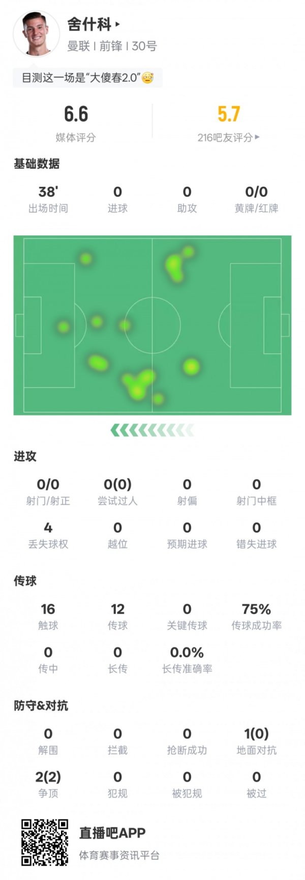 多项挂零!舍什科本场数据:0射门0过东谈主2次争顶均顺利,评分6.6