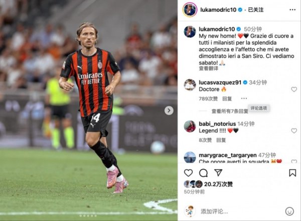 莫德里奇社媒:米兰我的新家,感谢米兰球迷予以我的迎接和暖热