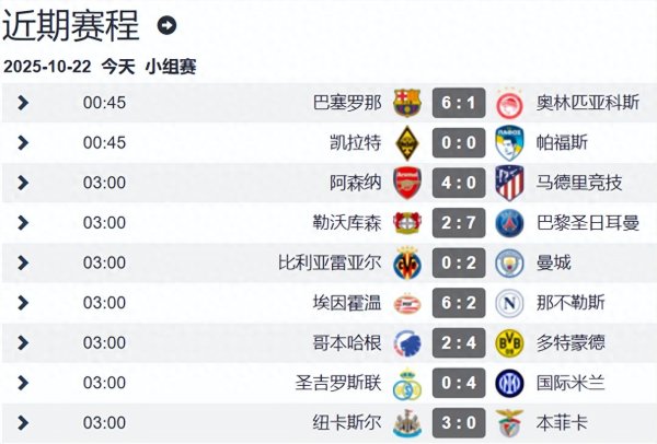 欧冠联赛阶段第3轮首日的9场比赛一经一说念战罢,各大朱门球队纷繁启动“屠杀”格局,意甲卫冕冠军那不勒斯大比分输荷甲球队确切脸都不要了,英超三队一说念成效。 巴萨6-1奥林匹亚科斯:费尔明戴帽,拉什福德双响,巴萨将以好气象招待周末的国度德比。 凯拉特0-0帕福斯:软柿子相遇,都是软趴趴,毫无存眷度。 阿森纳4-0马竞:英超领头羊展示实力,攻强守也强,约克雷斯双响,加布里埃尔和马丁内利破门。 勒沃库森2-7巴黎:两队各被罚下一东说念主,杜埃双响,登贝莱、克瓦拉茨赫利亚、门德斯、维......查看更多