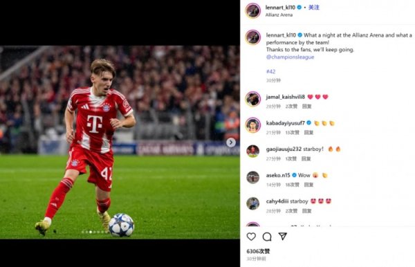 10月24日讯 拜仁在本轮欧冠4-0完胜布鲁日,小将伦纳特-卡尔开场天下波立功。 值得一提的是,这是他生计初度在欧冠首发,打进了欧冠处子球、成为拜仁队史最年青欧冠进球者,也在初度在赛后被欧冠官方评为全场最好球员。 他也在赛后通过社媒晒出我方的比赛照并配文:“在安联球场的精彩整夜,球队的阐明也太出色了!感谢球迷们,咱们会无间前进。”......查看更多