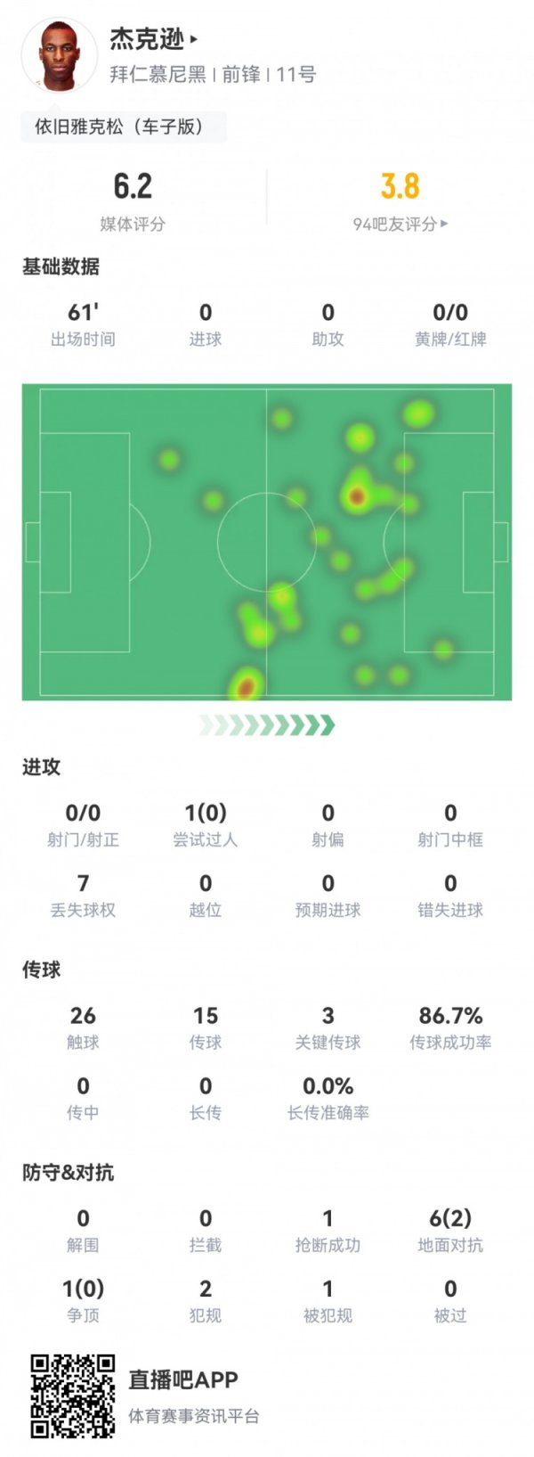 杰克逊数据:0射门,3次要害传球,7次丢失球权,评分仅6.2